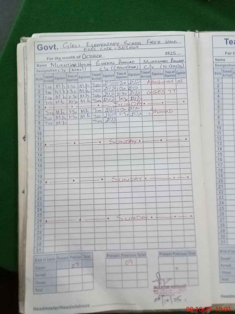 | Attendance Register | Head Teacher | MEA with School | Visit Proof |