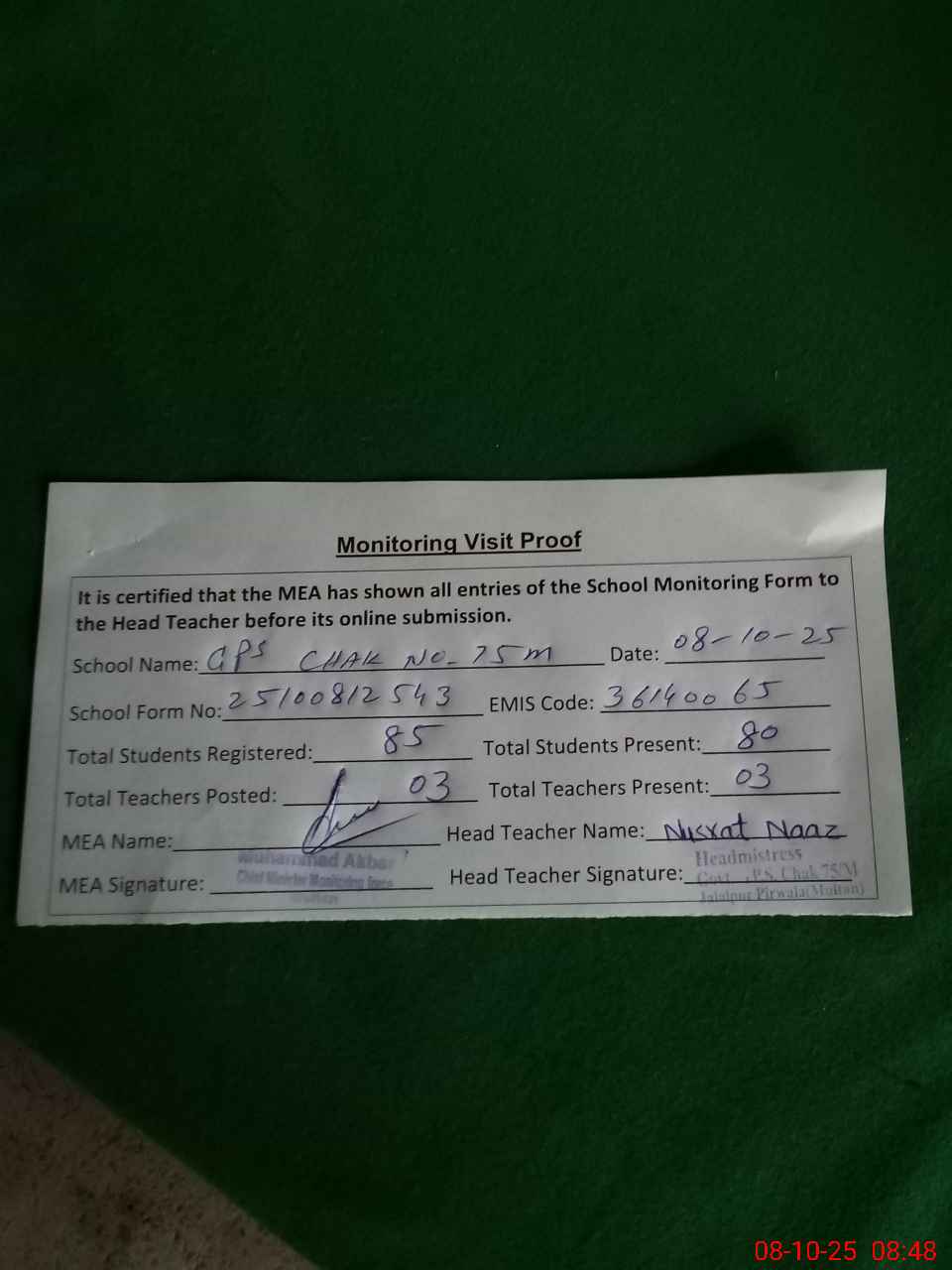 | EMIS Code: 36140065 | Name of School: GPS CHAK NO 75 M | |||