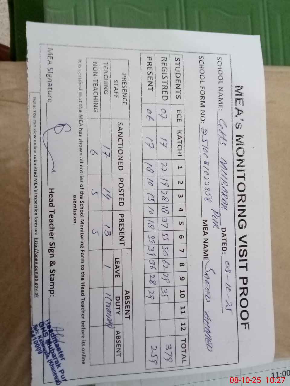| Attendance Register | Head Teacher | MEA with School | Visit Proof |