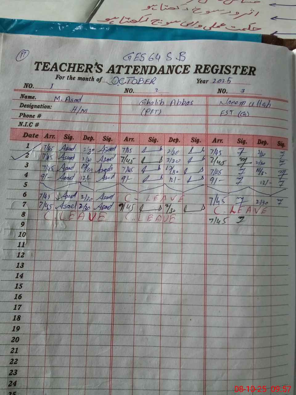 | CNIC | Full Name | Designation | R/C | Absence during last cal. month |