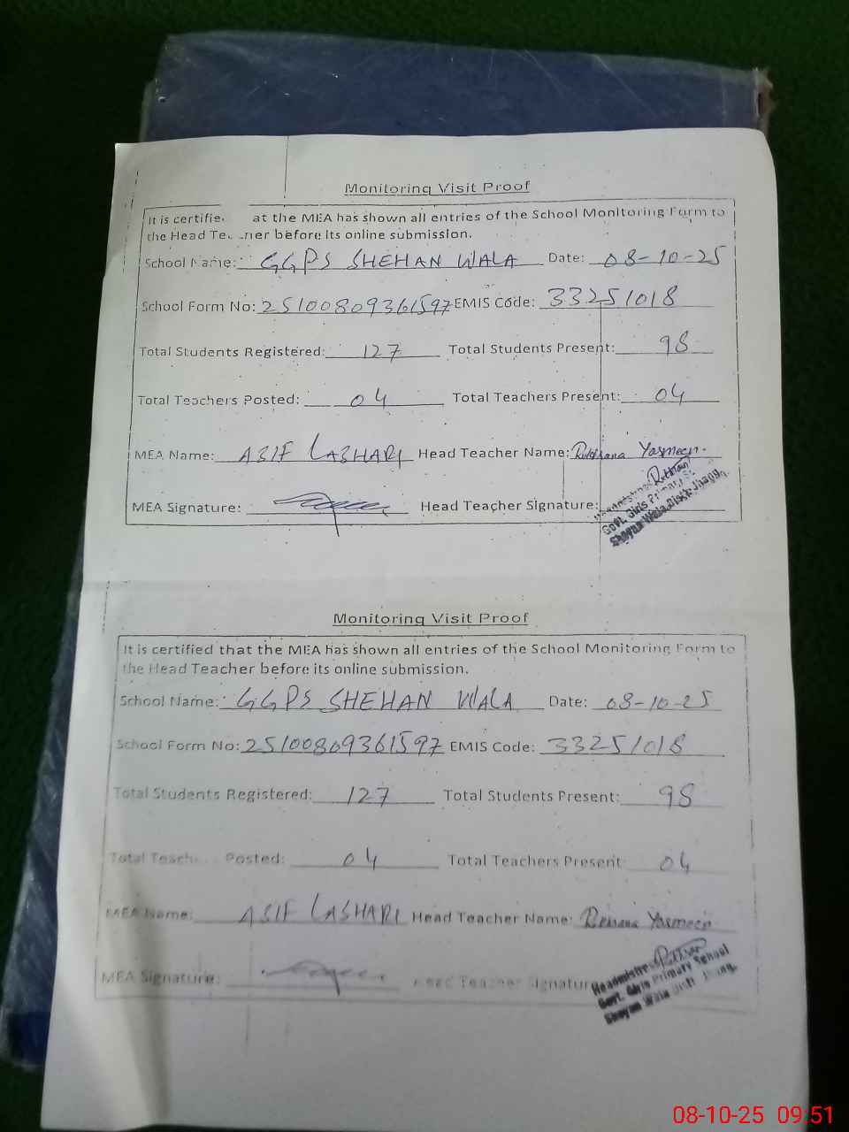 | Attendance Register | Head Teacher | MEA with School | Visit Proof |