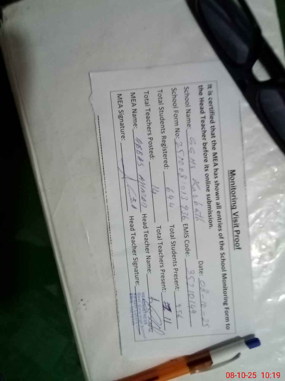 | Certified that this School was Inspected by the Undersigned MEA/DMO Today and the Information Stated Above is as Per Record. | |||||