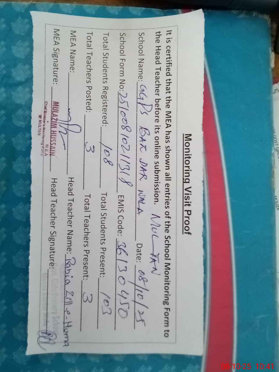 | Attendance Register | Head Teacher | MEA with School | Visit Proof |