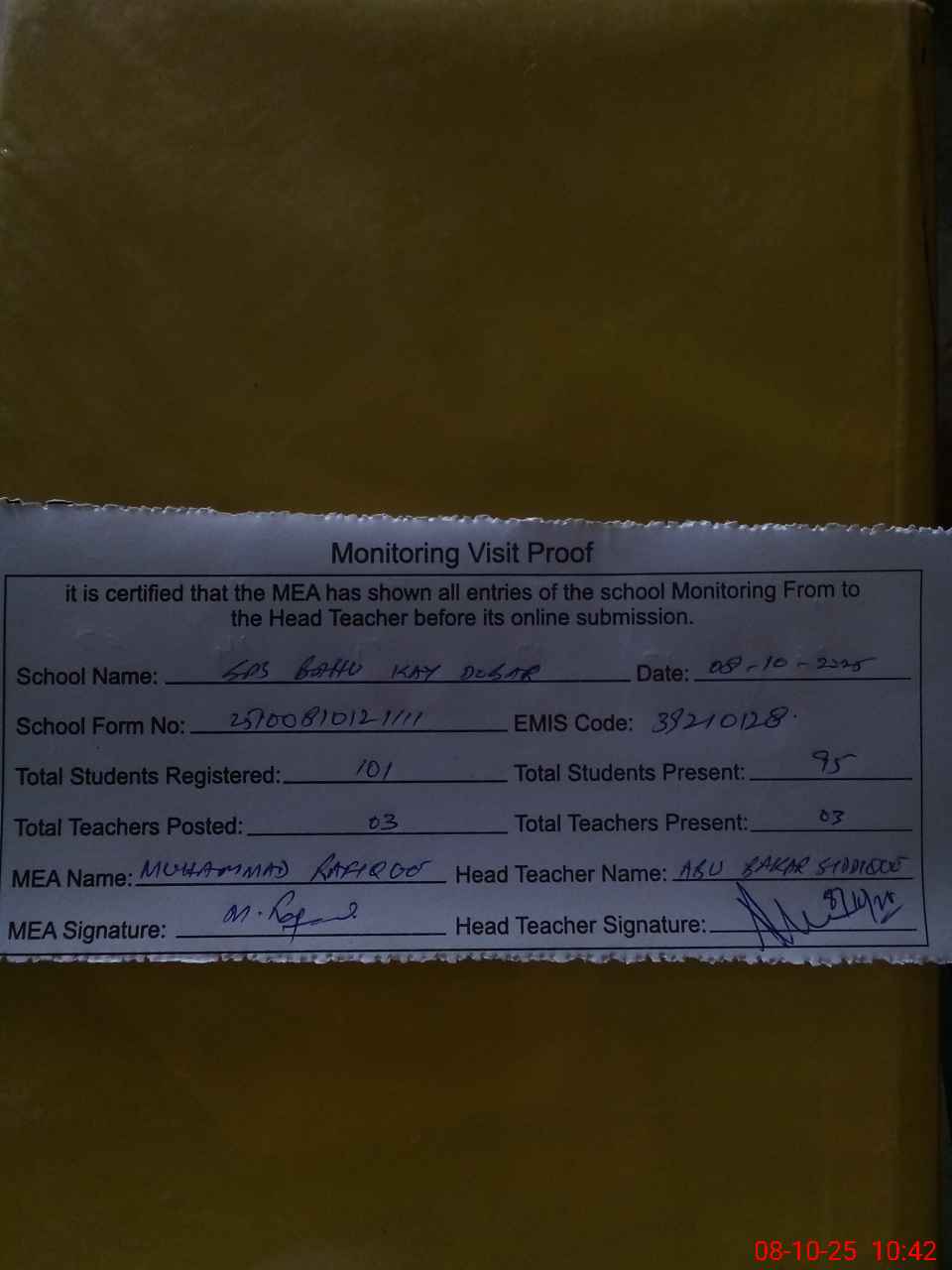 | Attendance Register | Head Teacher | MEA with School | Visit Proof |
