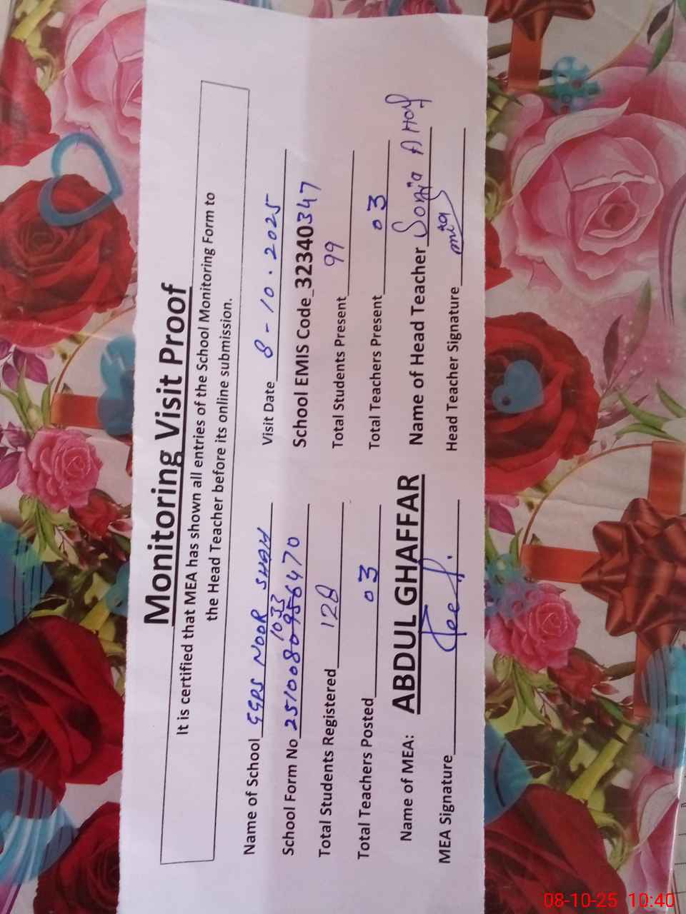 | Attendance Register | Head Teacher | MEA with School | Visit Proof |
