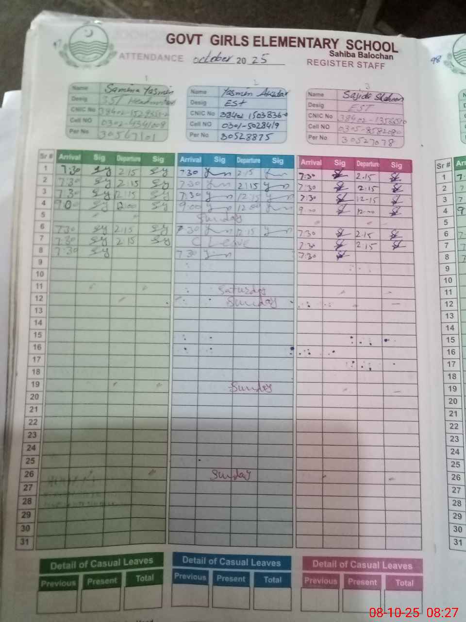| CNIC | Full Name | Designation | R/C | Absence During Last Calender Month |