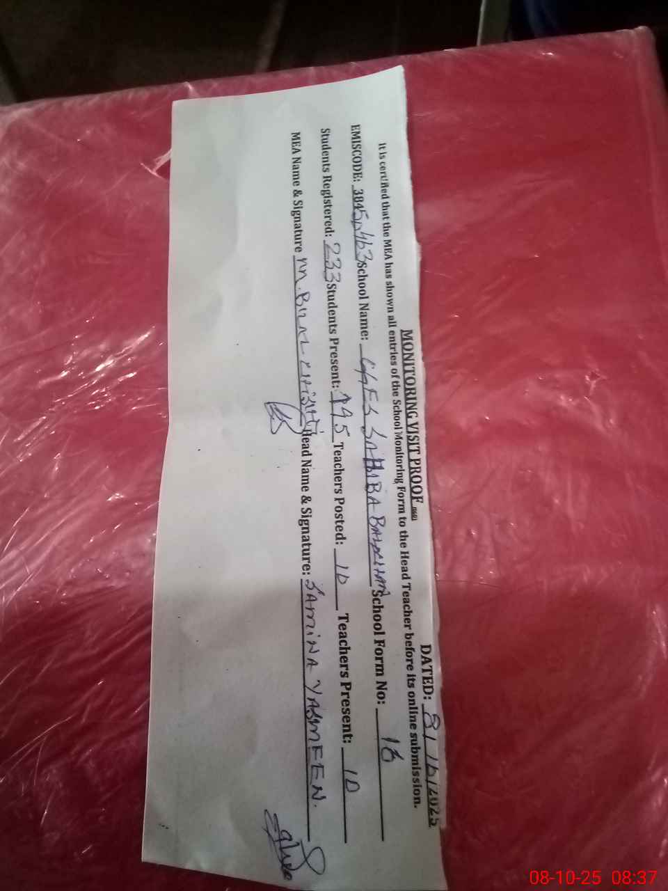 | Certified that this School was Inspected by the Undersigned MEA/DMO Today and the Information Stated Above is as Per Record. | |||||