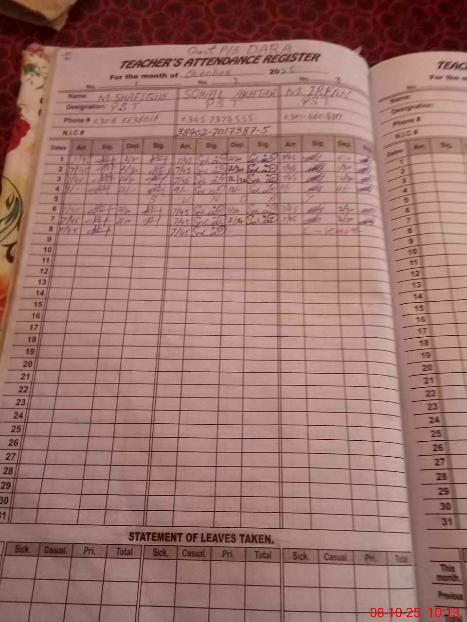 | Name: MU**** SH**** Designation: (School Headmaster's/Headmistress's) PST Phone/Cell Number: 03**** |