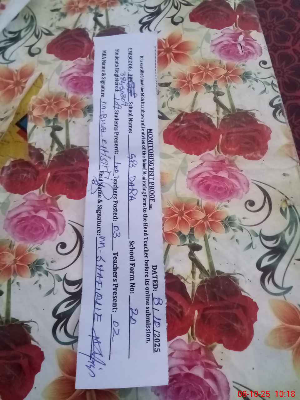 | Certified that this School was Inspected by the Undersigned MEA/DMO Today and the Information Stated Above is as Per Record. | |||||
