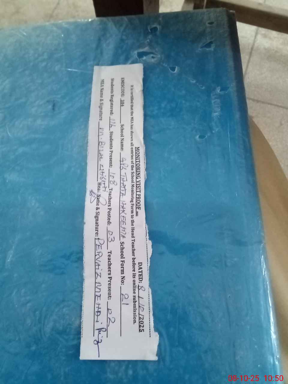 | Attendance Register | Head Teacher | MEA with School | Visit Proof |