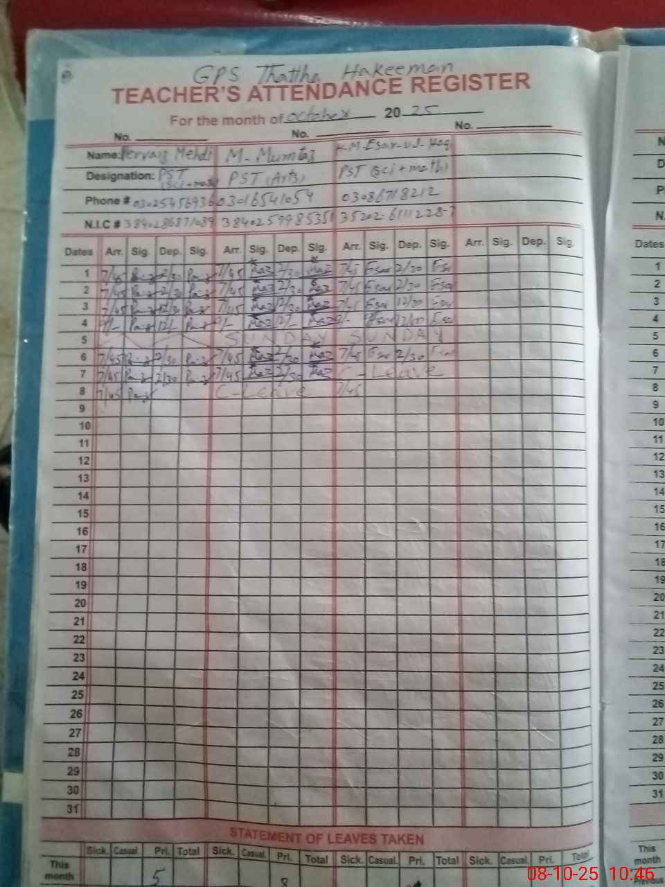 | Name: Ra**** Pe**** Me**** Designation: (School Headmaster's/Headmistress's) PST Science Phone/Cell Number: 03**** |