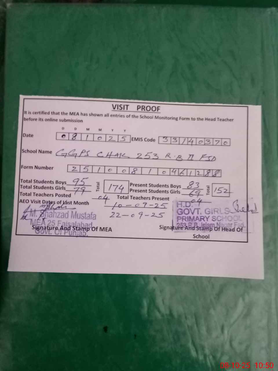 | Certified that this School was Inspected by the Undersigned MEA/DMO Today and the Information Stated Above is as Per Record. | |||||