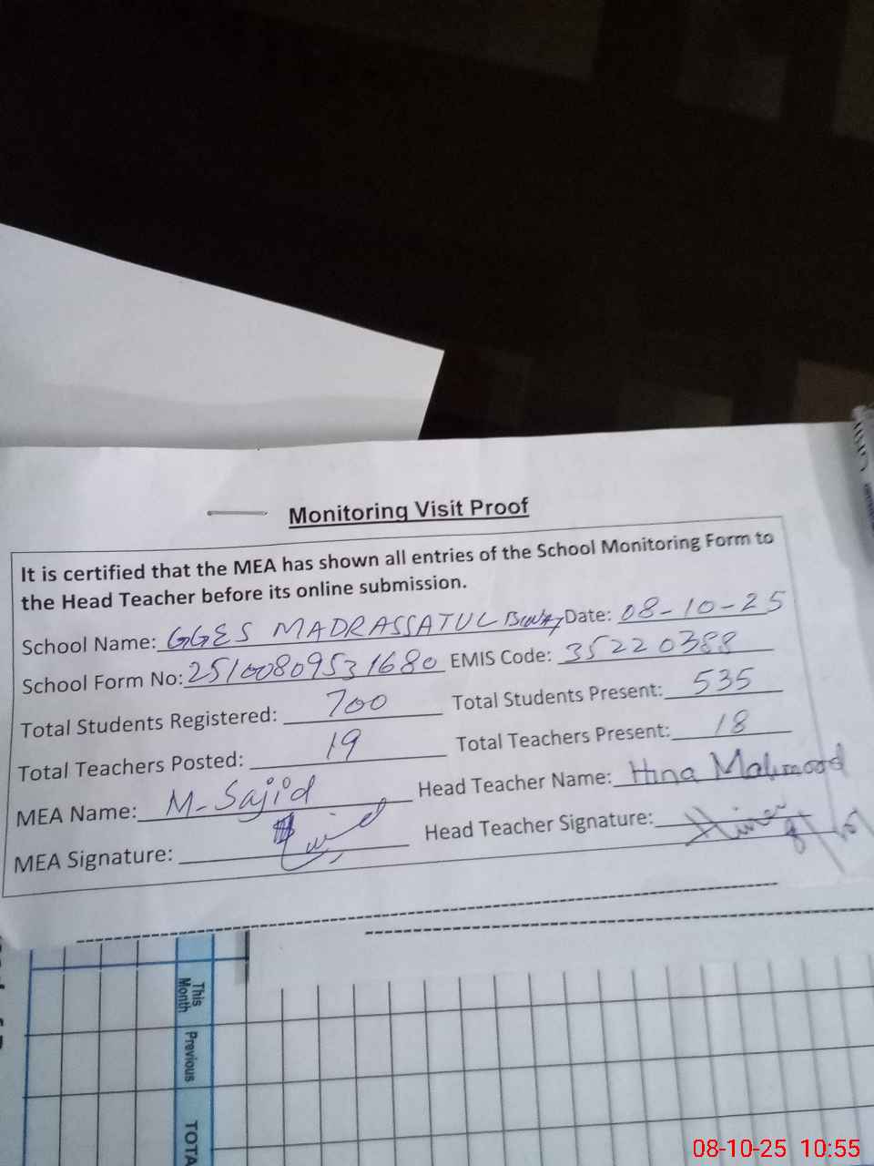 | Certified that this School was Inspected by the Undersigned MEA/DMO Today and the Information Stated Above is as Per Record. | |||||