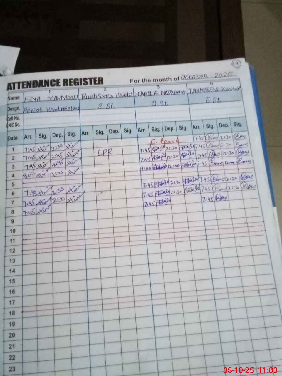 | CNIC | Full Name | Designation | R/C | Absence during last cal. month |
