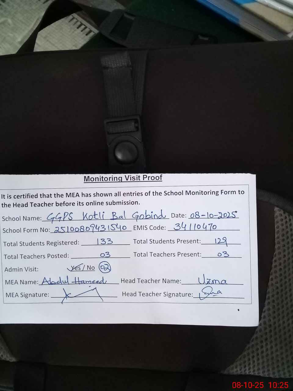 | Monitoring Date: 08-10-2025 | Start Time: 08-10-2025 09:43 AM | End Time: 08-10-2025 10:26 AM | Name of MEA: N-**** Ha**** | |