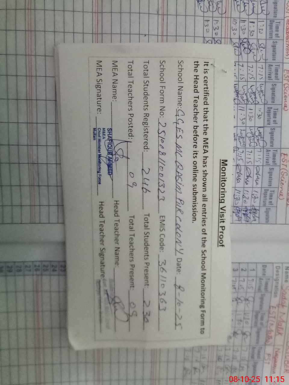 | Monitoring Date: 08-10-2025 | Start Time: 08-10-2025 11:00 AM | End Time: 08-10-2025 11:15 AM | Name of MEA: SH**** AH**** | |