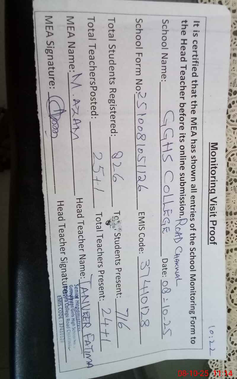 | EMIS Code: 37410128 | Name of School: GGHS COLLEGE ROAD CHAKWAL | |||