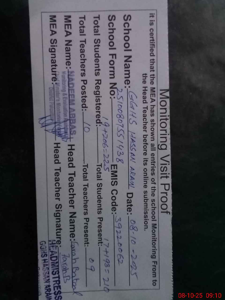 | EMIS Code: 39220062 | Name of School: GGHS HASSAN ARAIN | |||