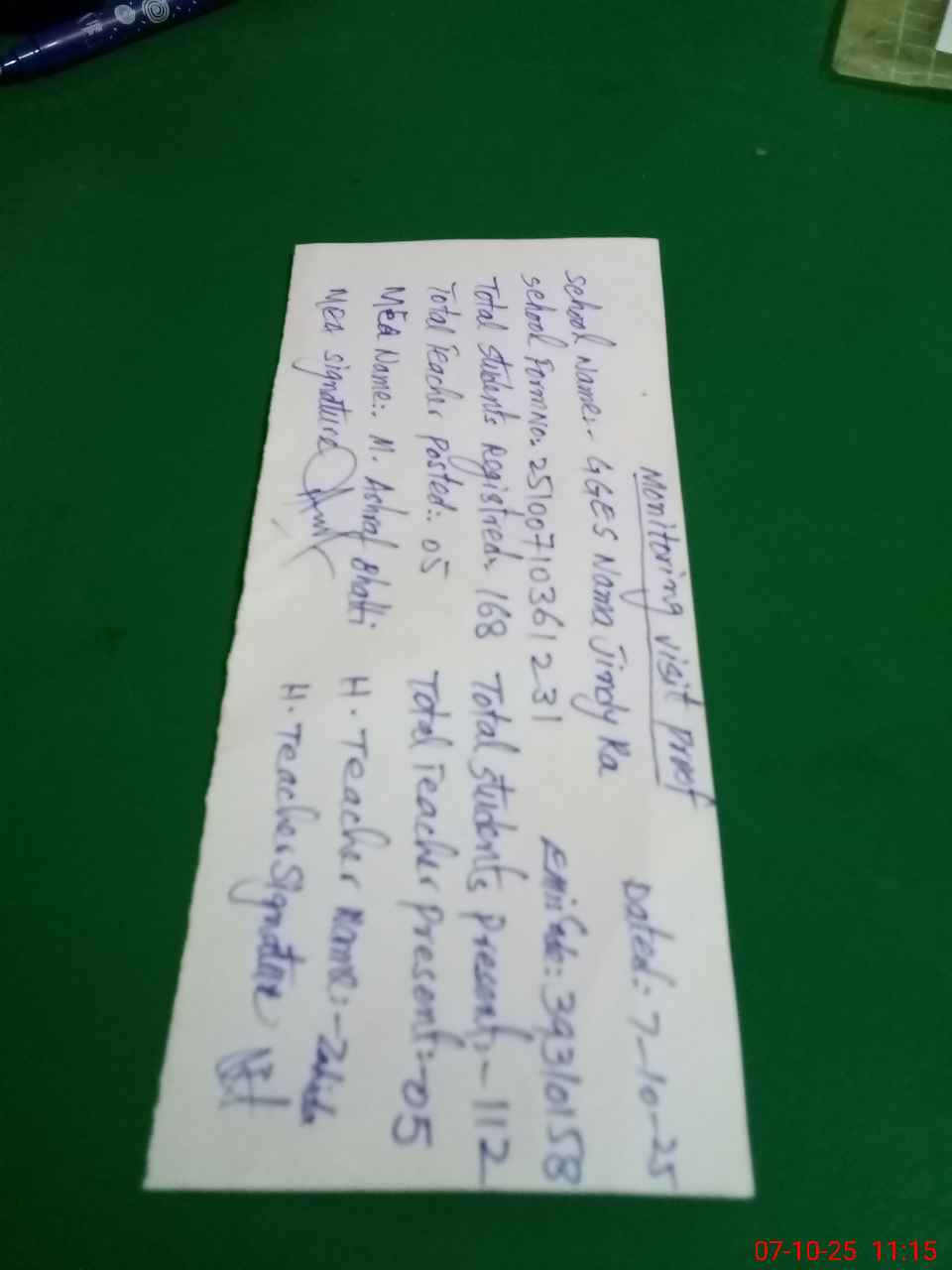 | Monitoring Date: 07-10-2025 | Start Time: 07-10-2025 10:36 AM | End Time: 07-10-2025 11:16 AM | Name of MEA: MU**** AS**** BH**** (R**** | |
