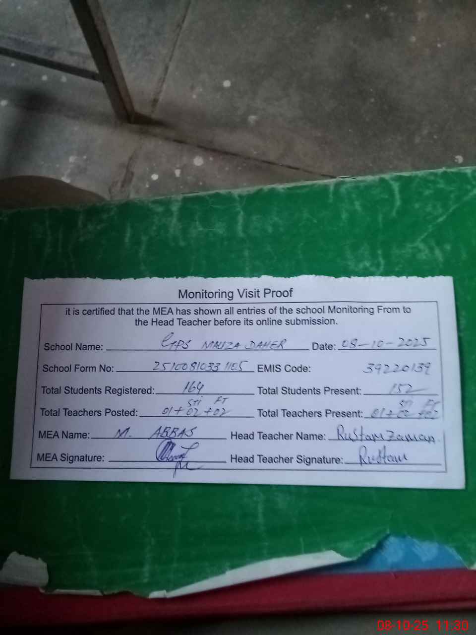 | Certified that this School was Inspected by the Undersigned MEA/DMO Today and the Information Stated Above is as Per Record. | |||||