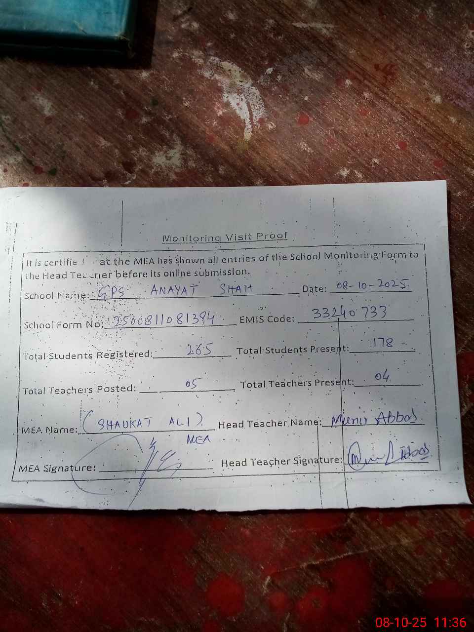 | EMIS Code: 33240733 | Name of School: GPS INAYAT SHAH | |||