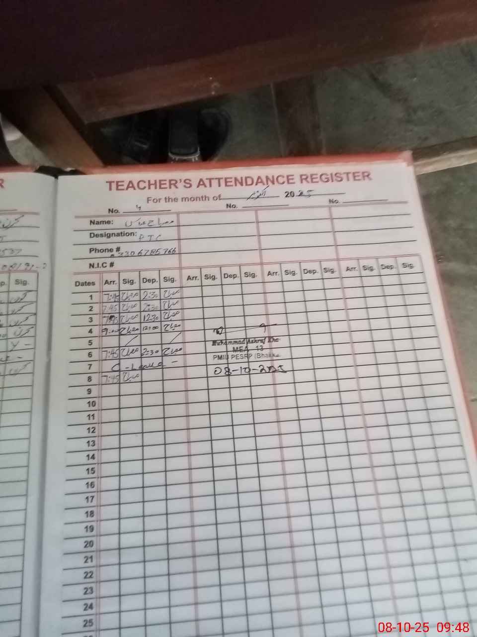 | Name: AB**** RA**** Designation: (School Headmaster's/Headmistress's) PTC/JV Phone/Cell Number: 03**** |