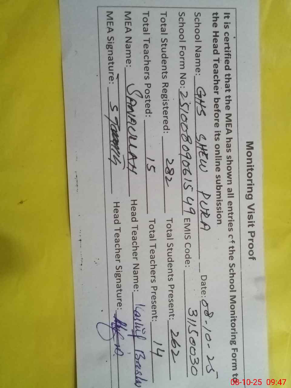 | EMIS Code: 31150030 | Name of School: GHS SHEW PURA | |||