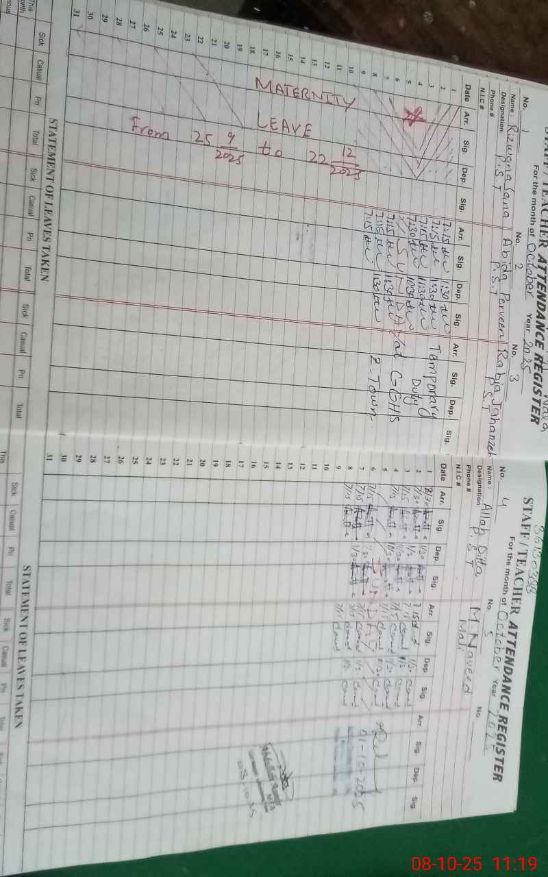 | Remarks (Use Separate Page if Required): Teacher Rabia Jhanzaib pst temp duty order expire on 26 Feb 2025 new order not held at school She was found absent since 27 Feb 2025 | |||||