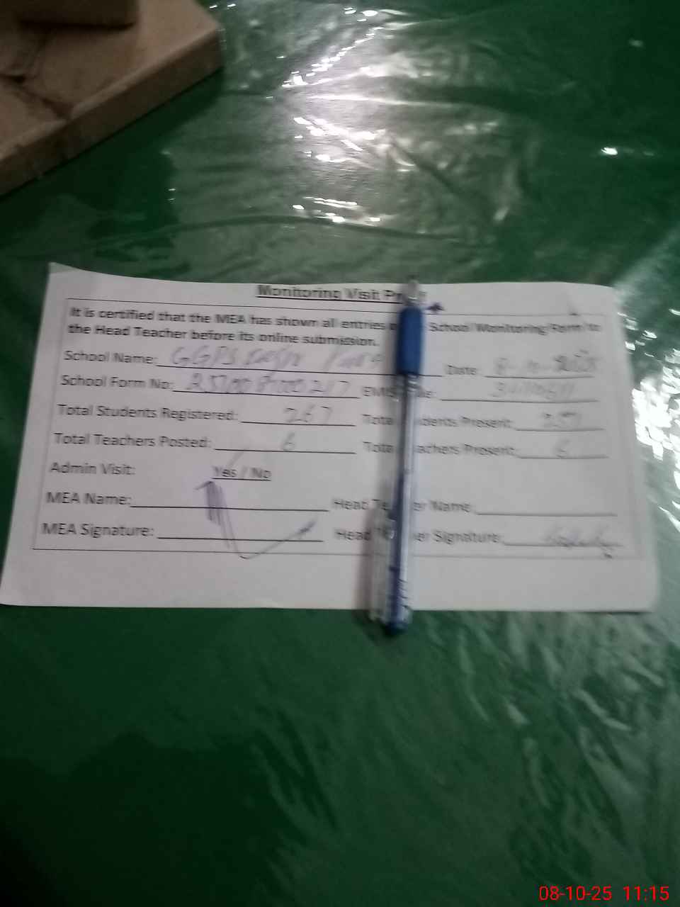 | Attendance Register | Head Teacher | MEA with School | Visit Proof |