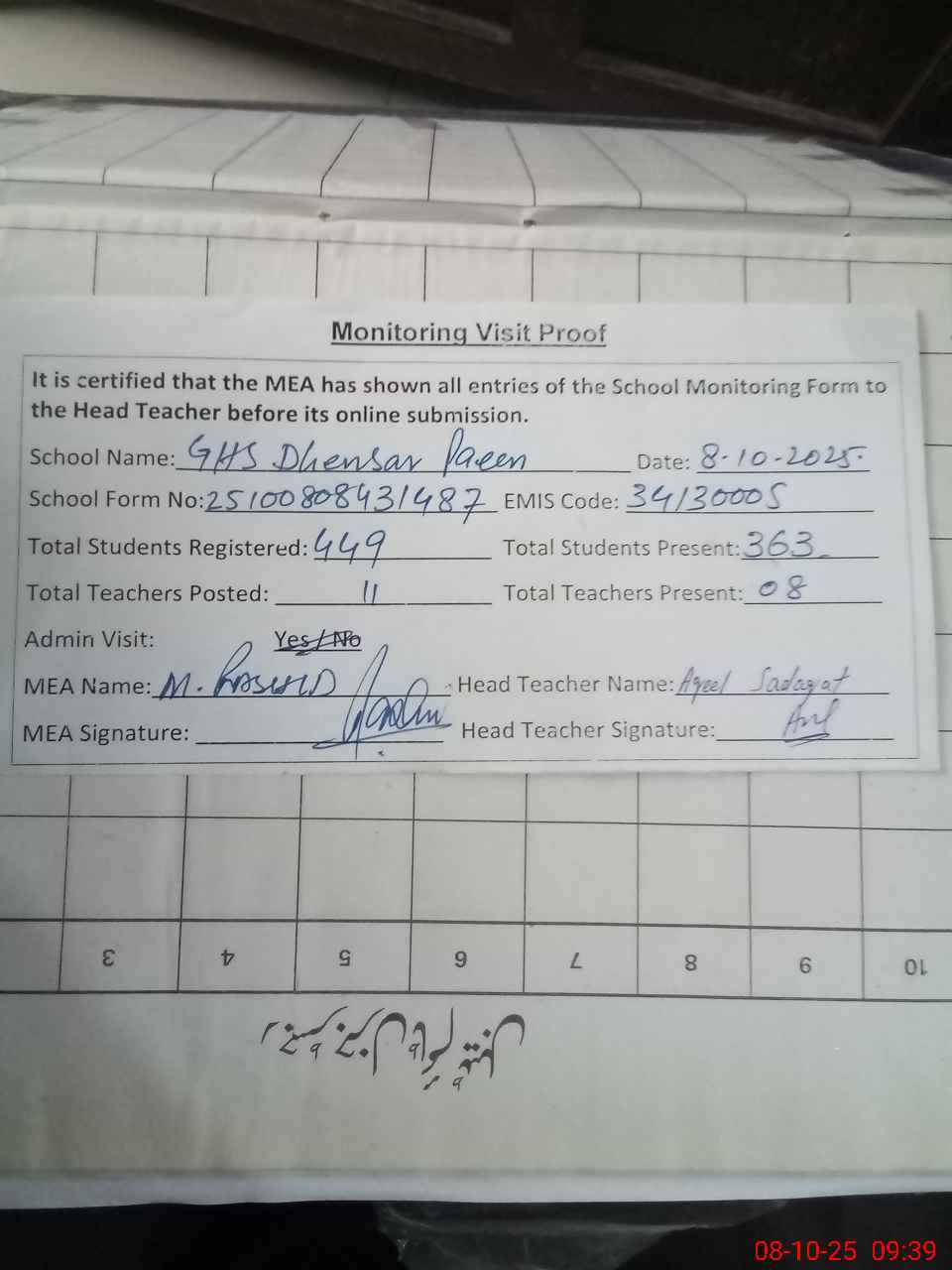 | Certified that this School was Inspected by the Undersigned MEA/DMO Today and the Information Stated Above is as Per Record. | |||||