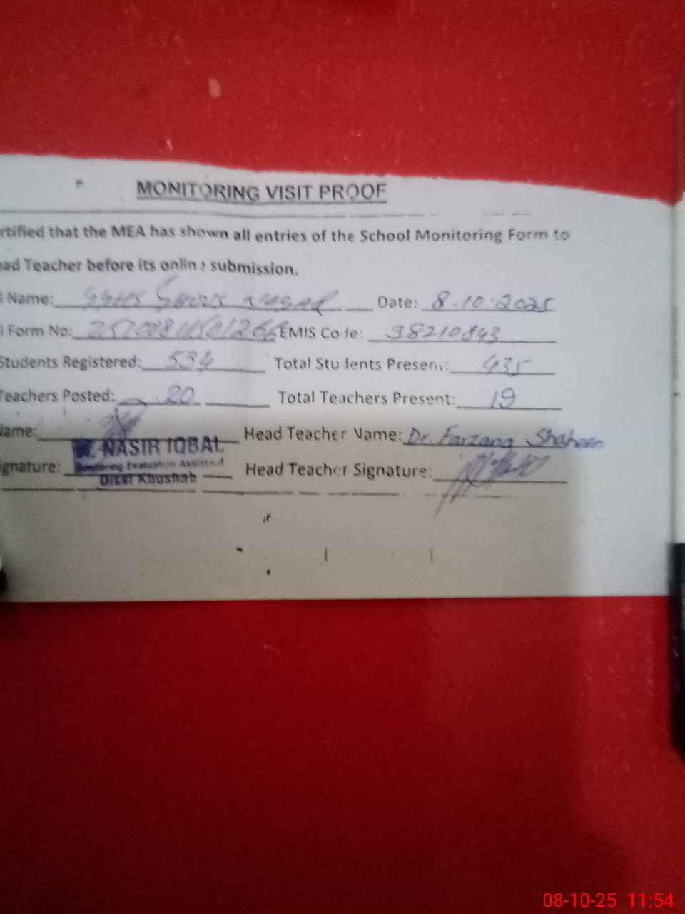 | Attendance Register | Head Teacher | MEA with School | Visit Proof |