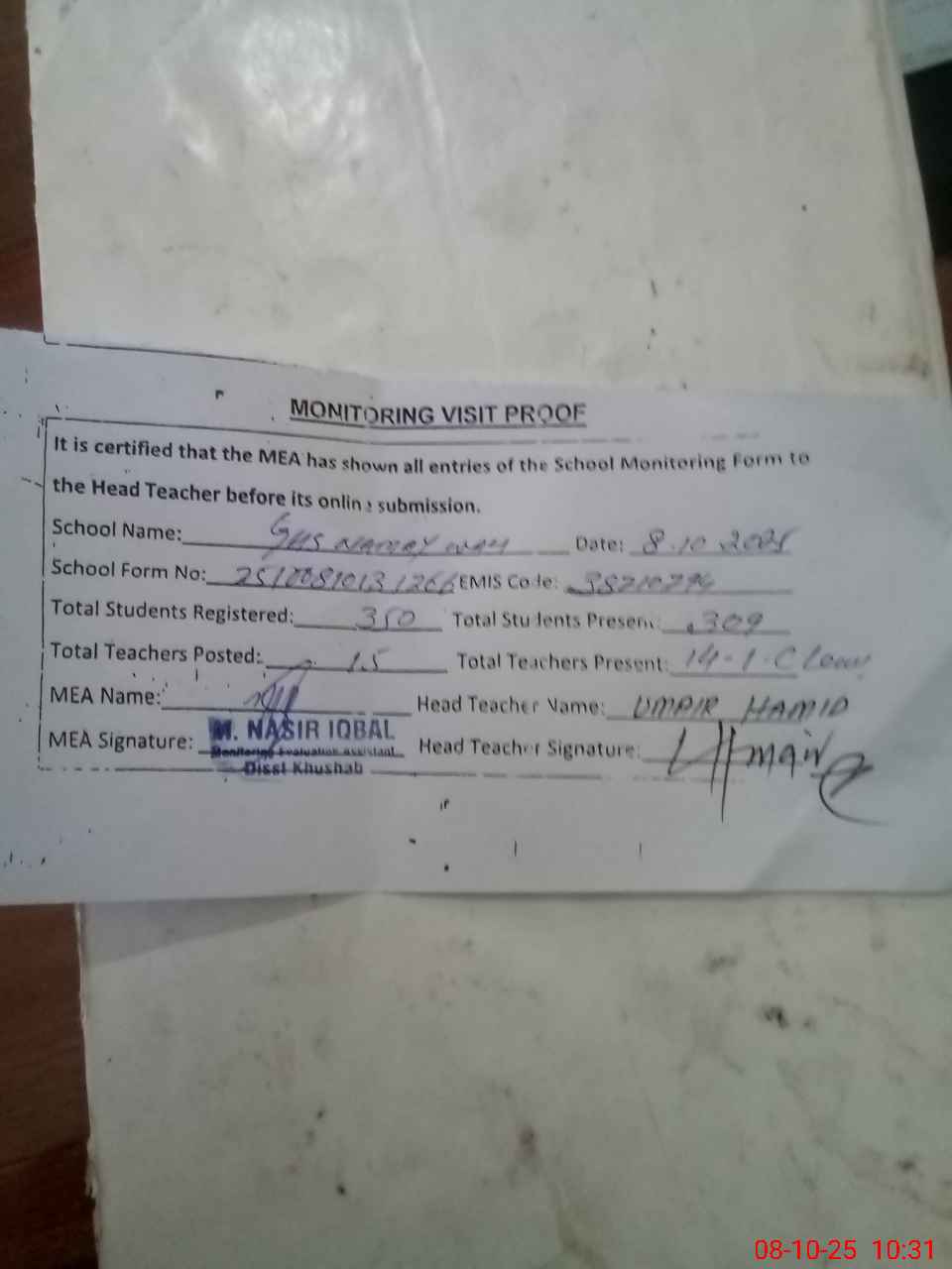 | Certified that this School was Inspected by the Undersigned MEA/DMO Today and the Information Stated Above is as Per Record. | |||||