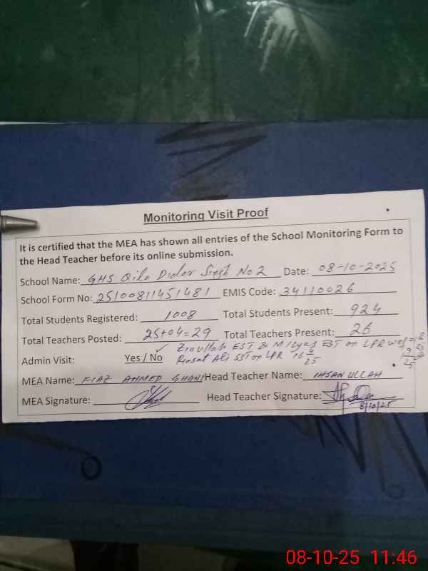 | Remarks (Use Separate Page if Required): Attendance of teaching staff and students on SIS Software is not updated Following Teachers are on LPR w e f mentioned against each Riasat Alli SST 16 April 2025 Ziaullah EST 01 March 2025 Muhammad Ilyas EST 01 September 2025 Following Teachers are on posted strength of this School but yet not updated on SIS Software Abdul Kabeer SST Arts Faisal Javed EST Science Ijaz Ahmad Dar presently on PSER Training Saeed Ahmad EST Munawar Hussain SST has been retired from service w e f 02 February 2025 Muhammad Aziz ul Aleem EST has been died on 16 July 2025 Data as per provided by School Staff and found during physical visit | |||||