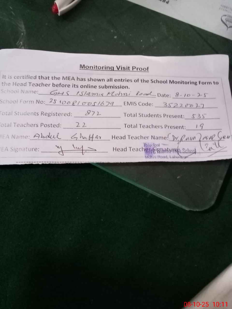 | EMIS Code: 35220027 | Name of School: GHS ISLAMIA MOHNI ROAD | |||