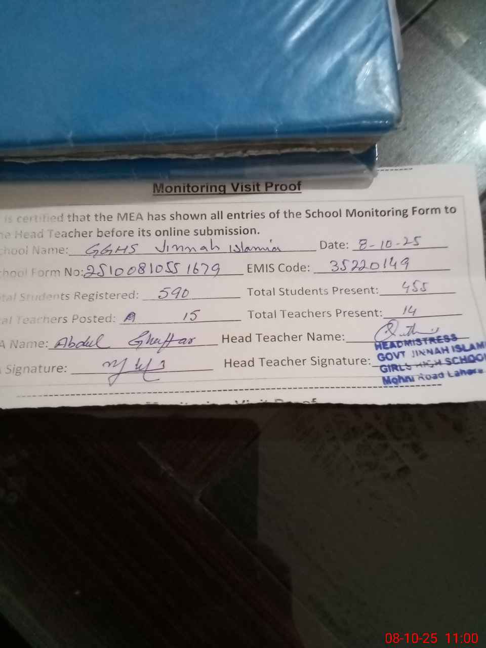 | Certified that this School was Inspected by the Undersigned MEA/DMO Today and the Information Stated Above is as Per Record. | |||||