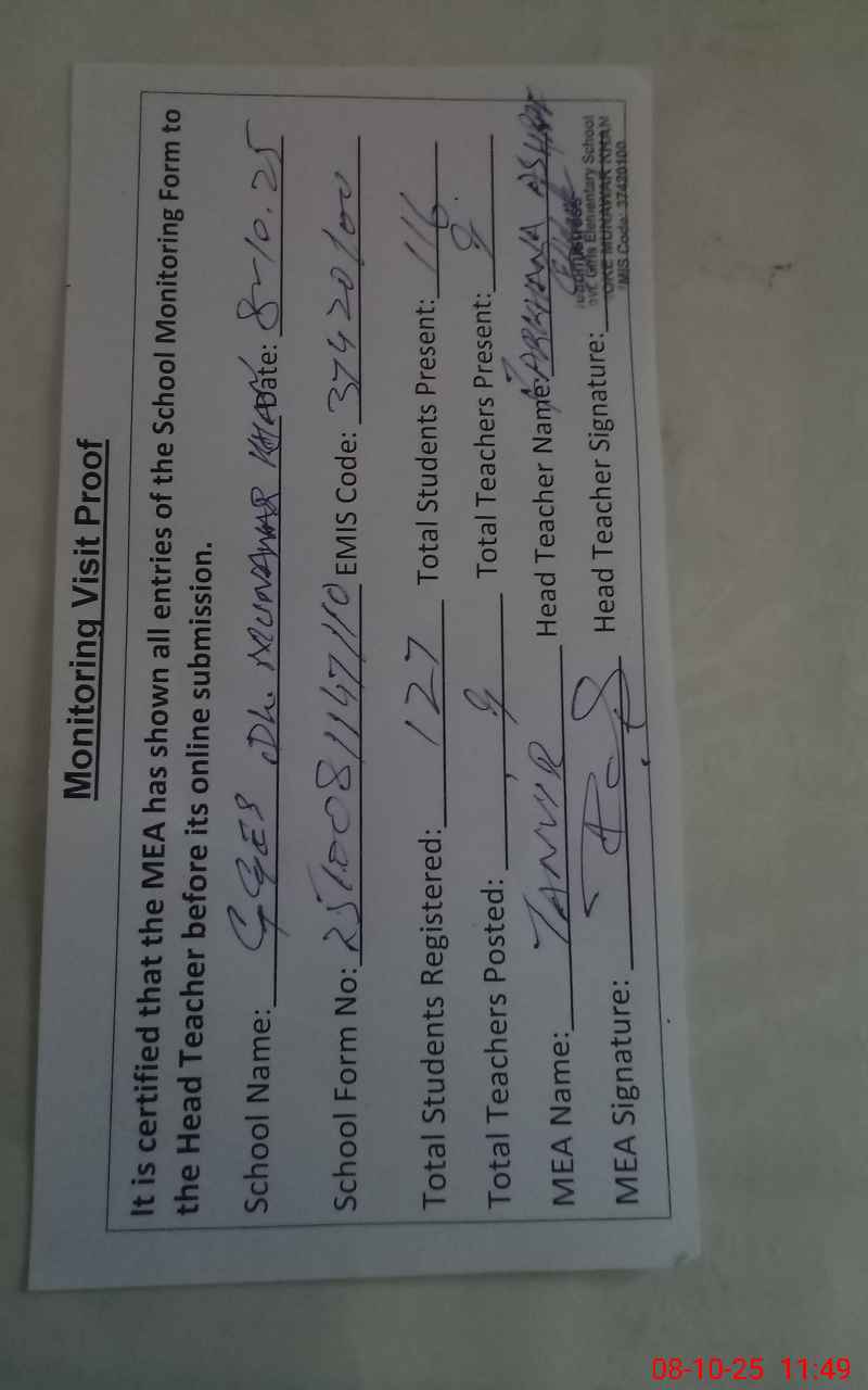 | Attendance Register | Head Teacher | MEA with School | Visit Proof |