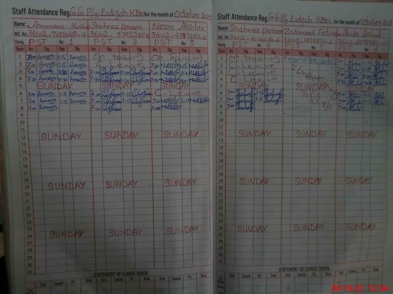 | CNIC | Full Name | Designation | R/C | Absence During Last Calender Month |