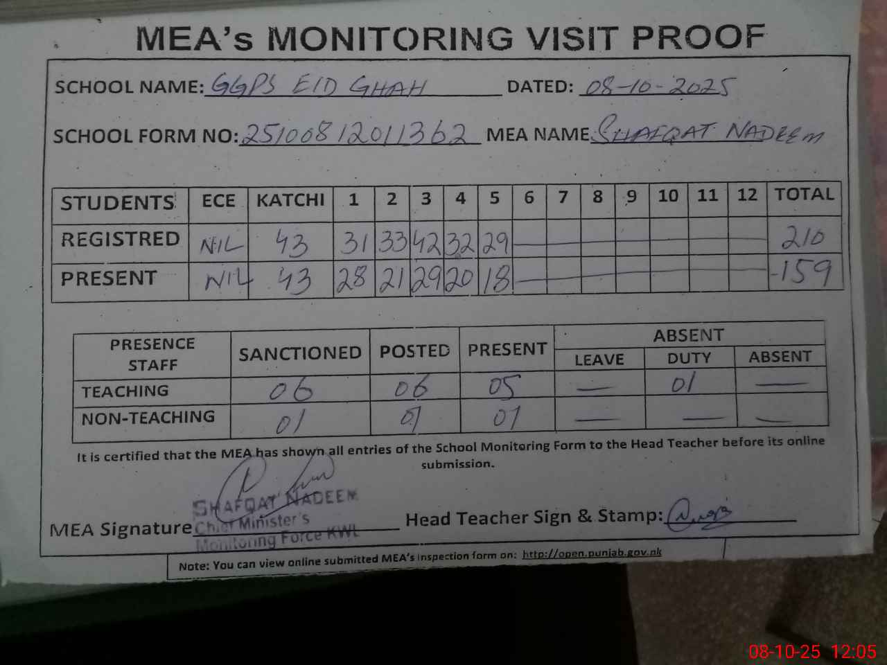 | Attendance Register | Head Teacher | MEA with School | Visit Proof |