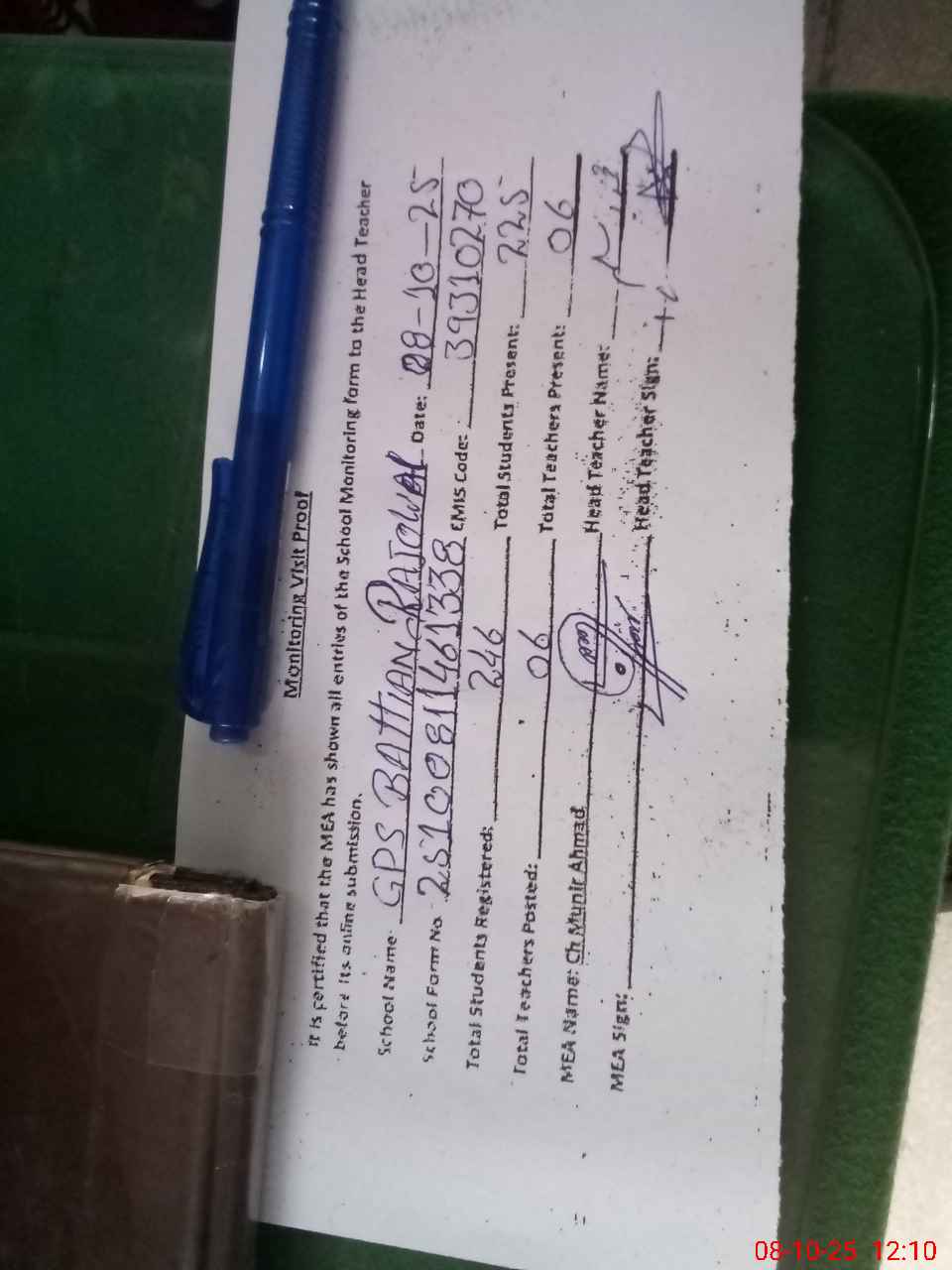 | Attendance Register | Head Teacher | MEA with School | Visit Proof |