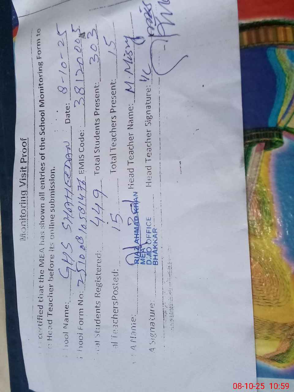 | Attendance Register | Head Teacher | MEA with School | Visit Proof |