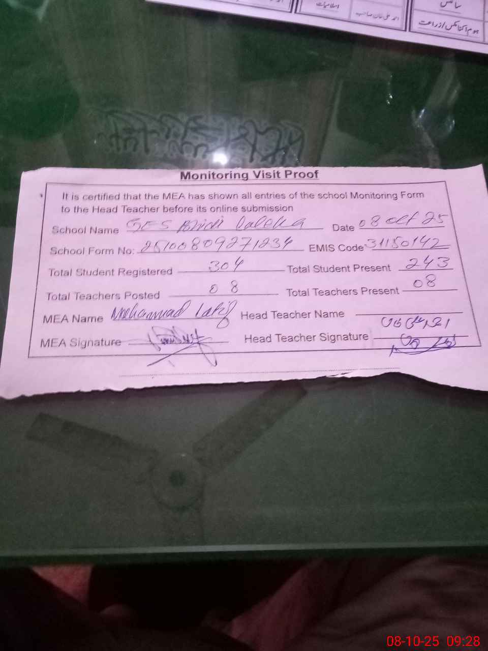 | Attendance Register | Head Teacher | MEA with School | Visit Proof |