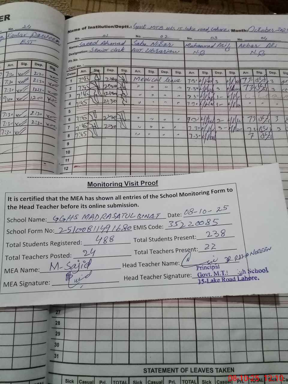 | Remarks (Use Separate Page if Required): Cleanliness is appriciable School is using two classrooms of Collage Assistant Librarian Saba Nisar has applied for medical leave and is in process Present students percentage is 49 Three classrooms need repairing 35220085 | |||||