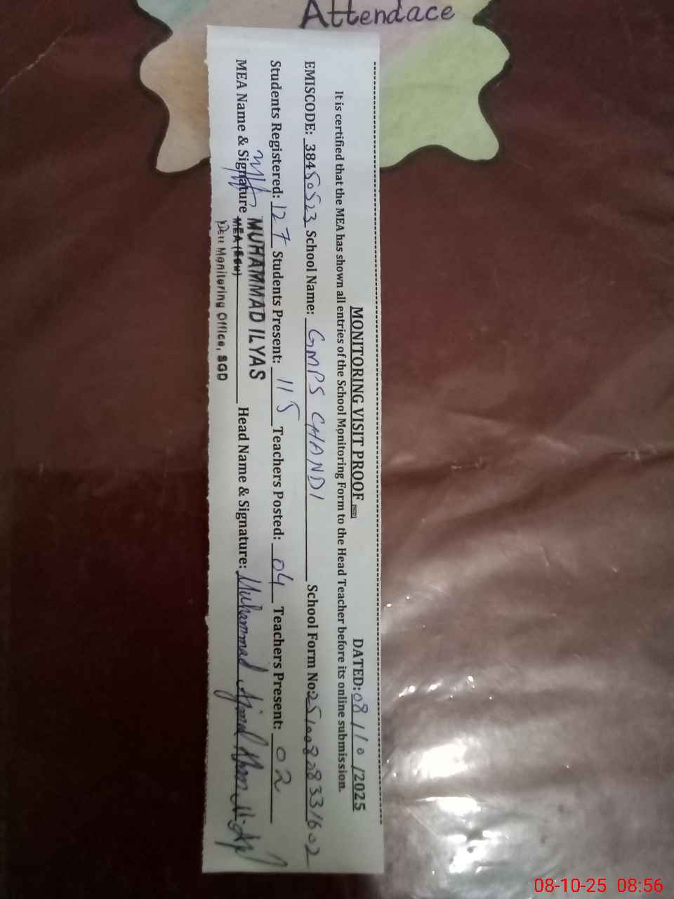 | Attendance Register | Head Teacher | MEA with School | Visit Proof |