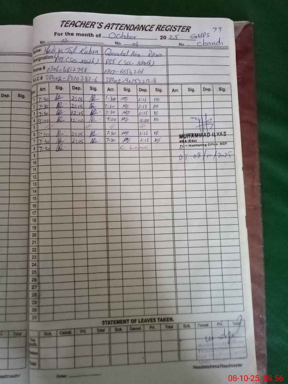 | Name: MU**** AJ**** KH**** Designation: (School Headmaster's/Headmistress's) PTC/JV Phone/Cell Number: 03**** |