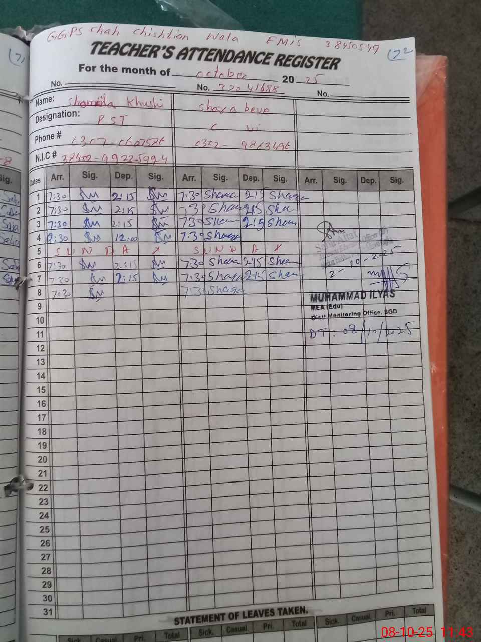 | Name: NA**** RA**** Designation: (School Headmaster's/Headmistress's) PST Phone/Cell Number: 03**** |