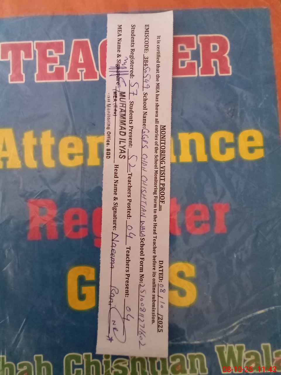 | Attendance Register | Head Teacher | MEA with School | Visit Proof |