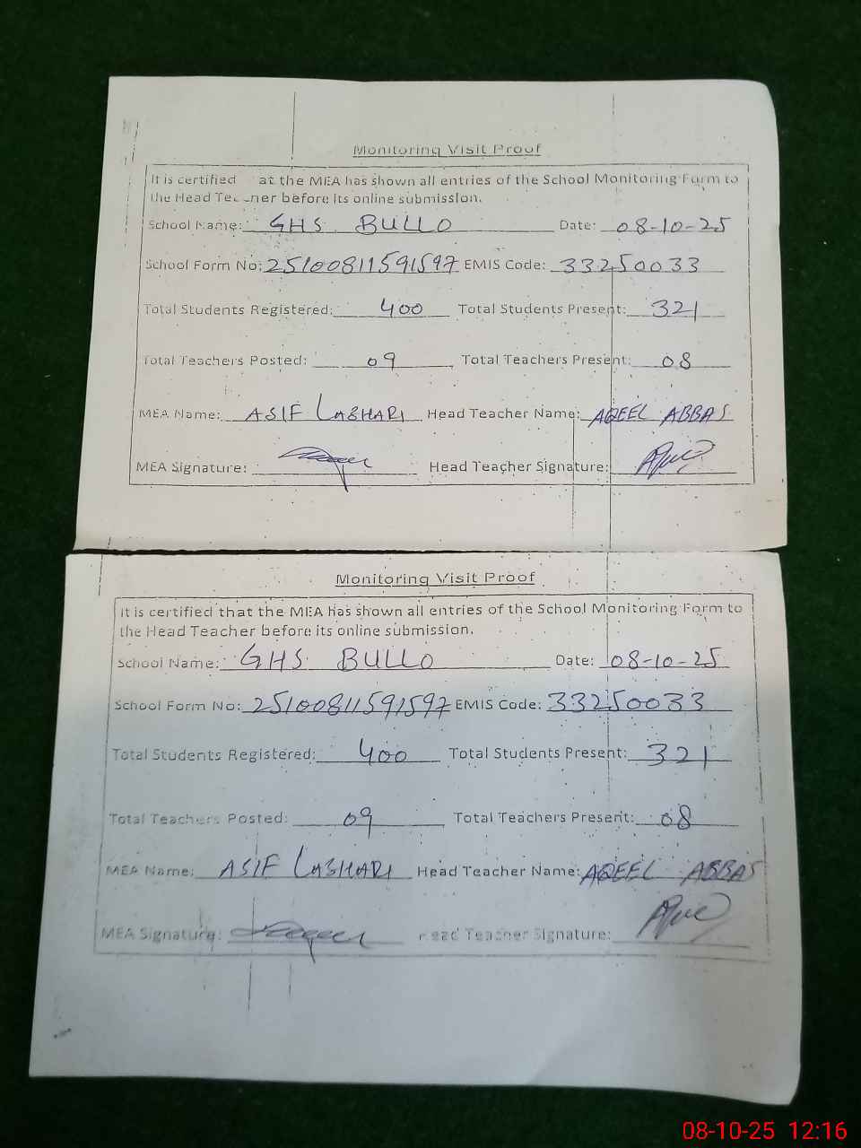 | Attendance Register | Head Teacher | MEA with School | Visit Proof |