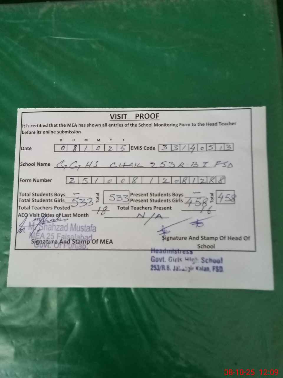 | EMIS Code: 33140513 | Name of School: GGHS CHAK 253 RB 1 JAHANGIR KALAN | |||
