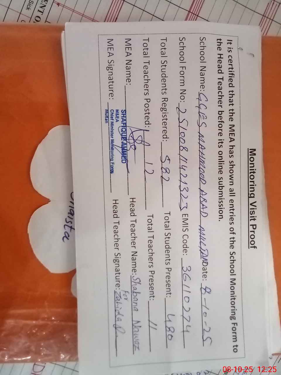 | Attendance Register | Head Teacher | MEA with School | Visit Proof |