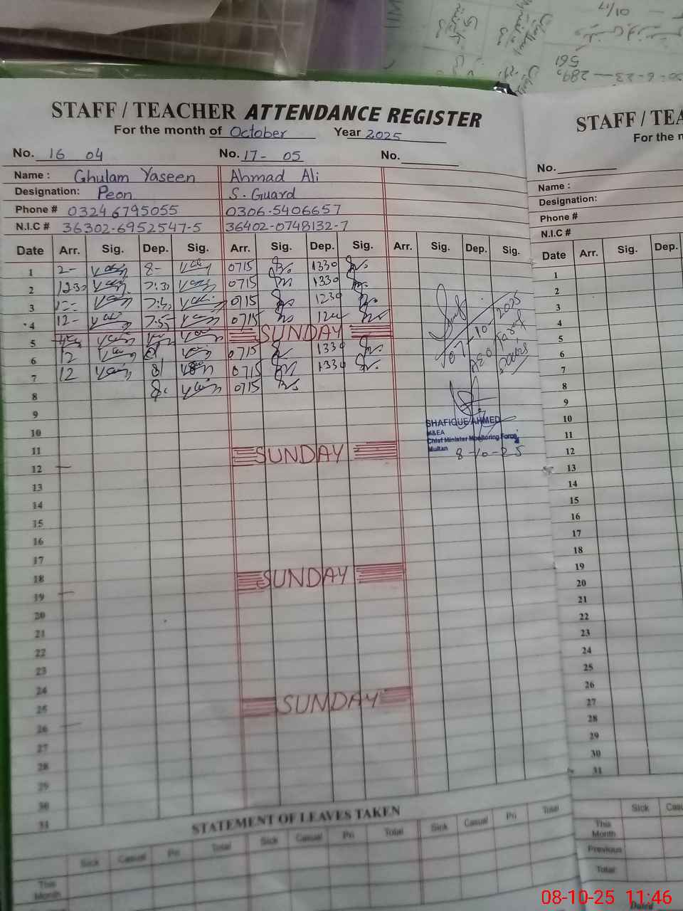 | CNIC | Full Name | Designation | R/C | Absence during last cal. month |